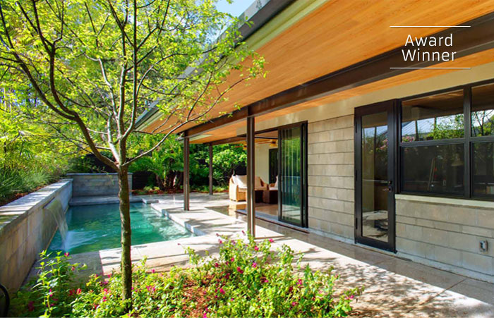 - Placement of design elements: Swimming pool, waterfall, planter/cistern and garden wall create a private inner atmosphere that is enjoyed from inside the home as well as in the garden
